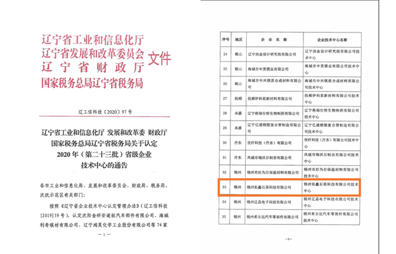 2020年8月28日,經(jīng)遼寧省工業(yè)和信息化廳、發(fā)展和改革委、財政廳、國家稅務(wù)總局遼寧省稅務(wù)局的聯(lián)合審定,佑鑫石英研發(fā)部獲批為第二十三批省級企業(yè)技術(shù)中心。